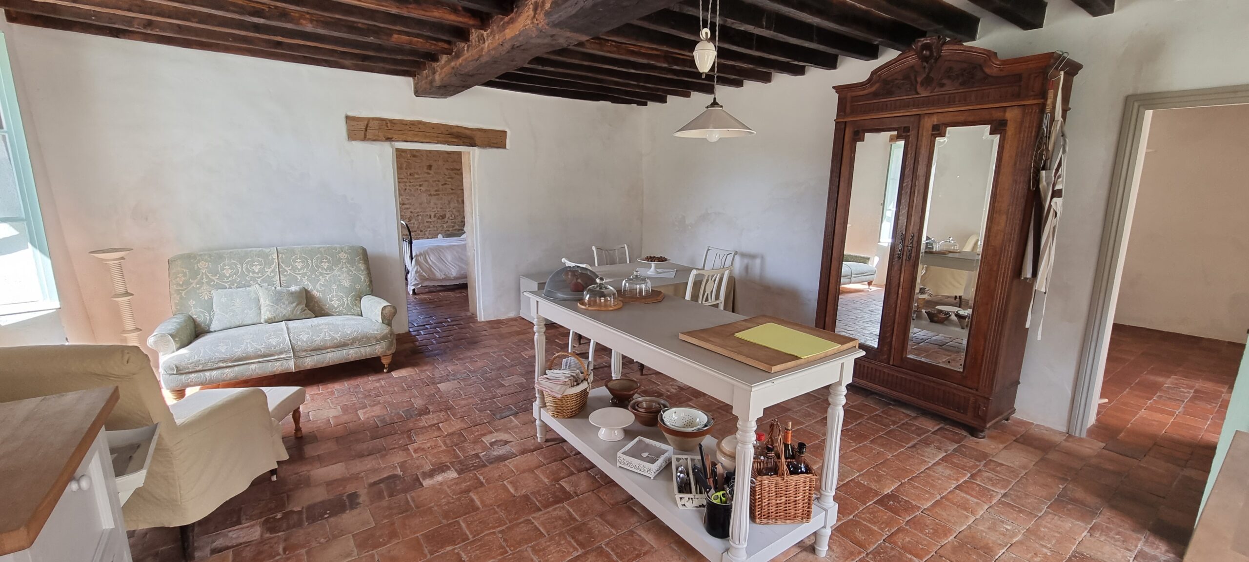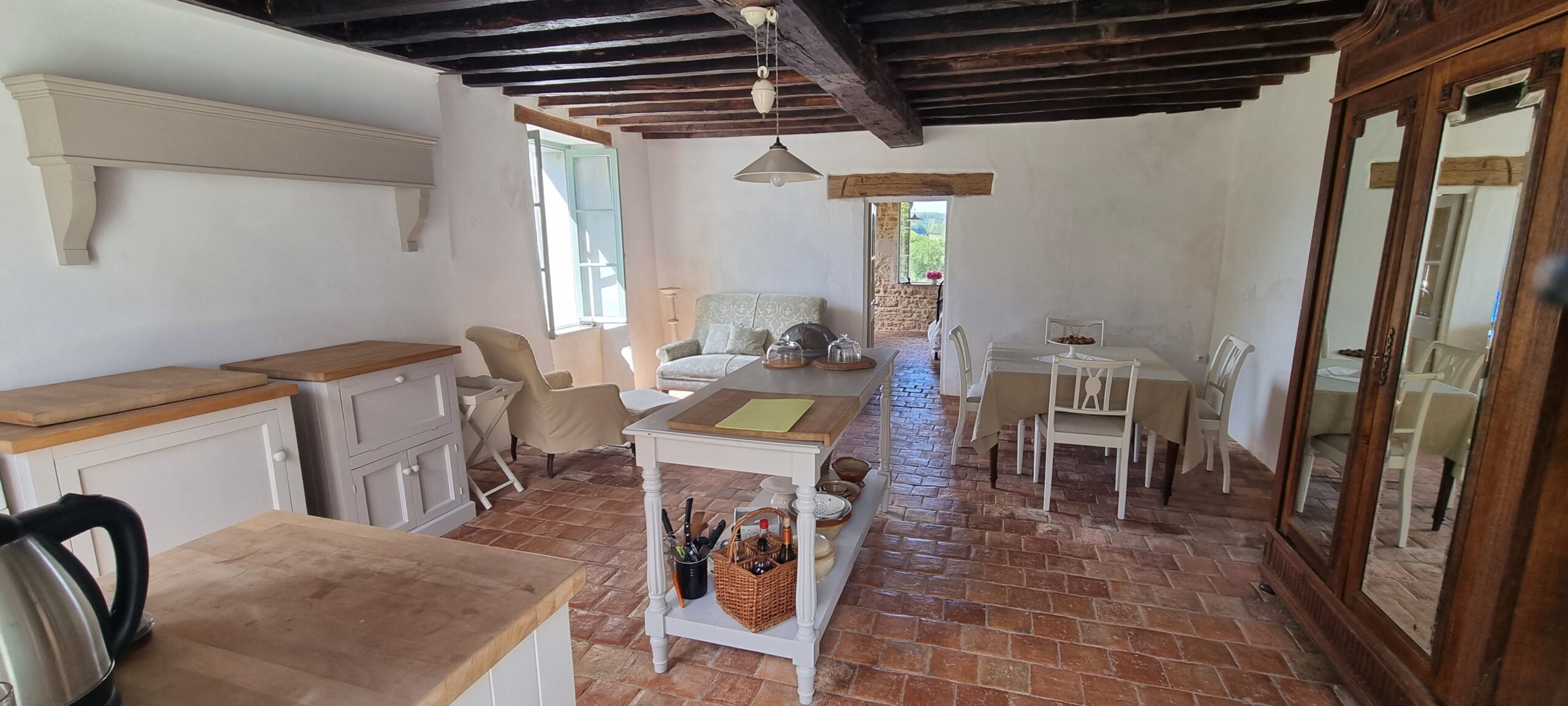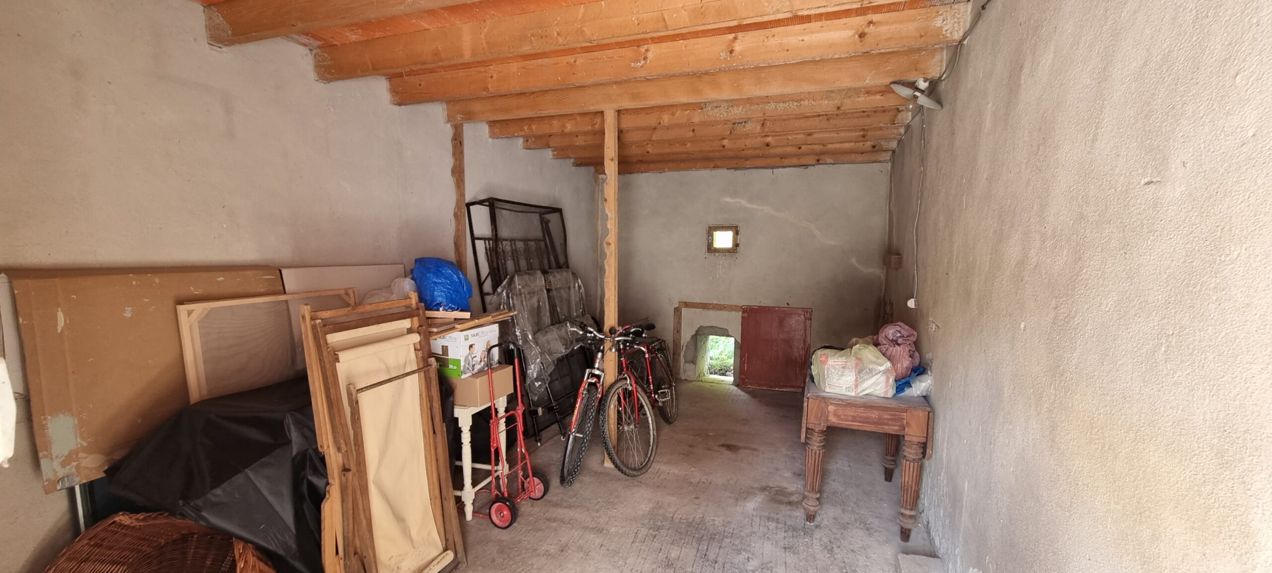 Entrée sur cuisine-salle à manger (poutres, tomettes, conduit de cheminée) 30 m², dégagement 10 m², salle de bains-WC (baignoire + douche ) 10 m², une chambre 20 m², grenier sur le tout accessible par l’extérieur.