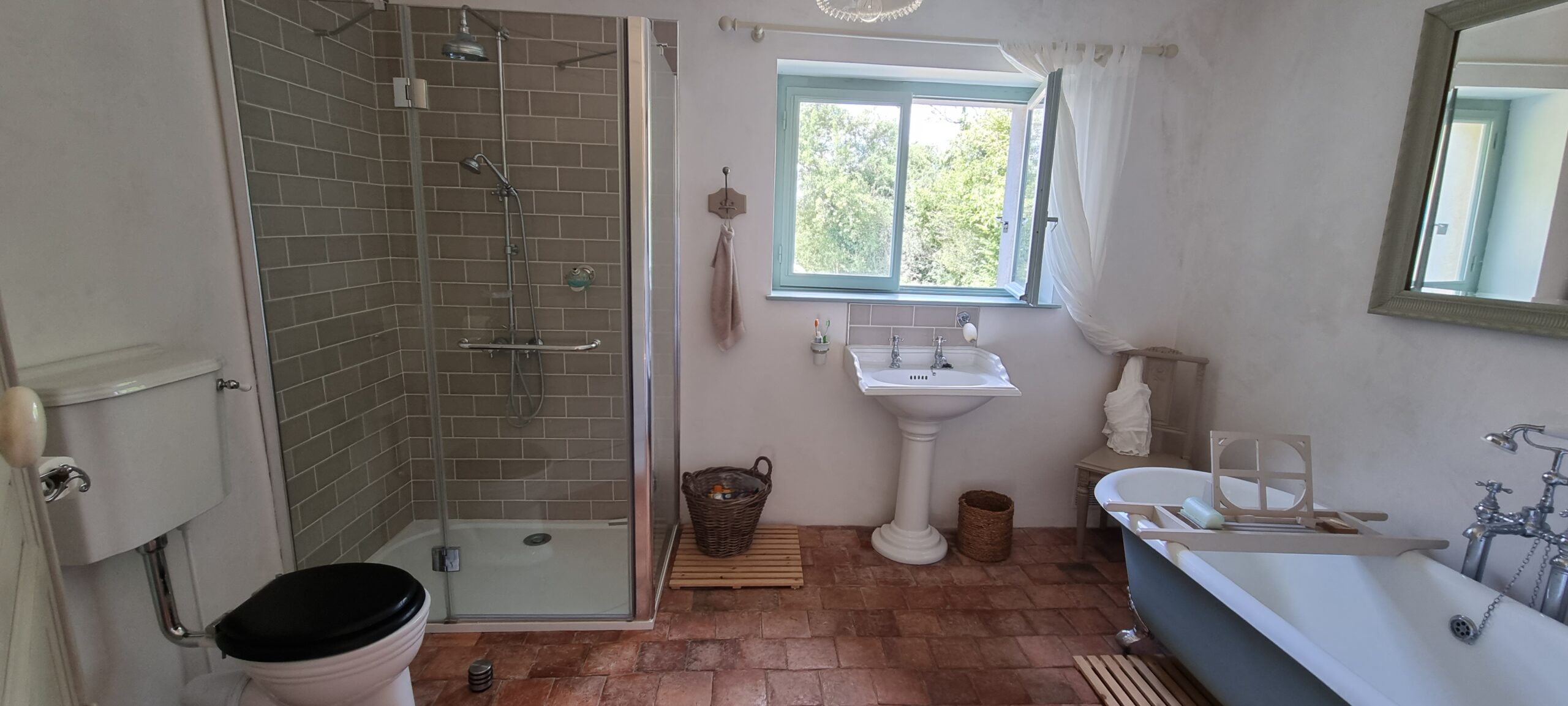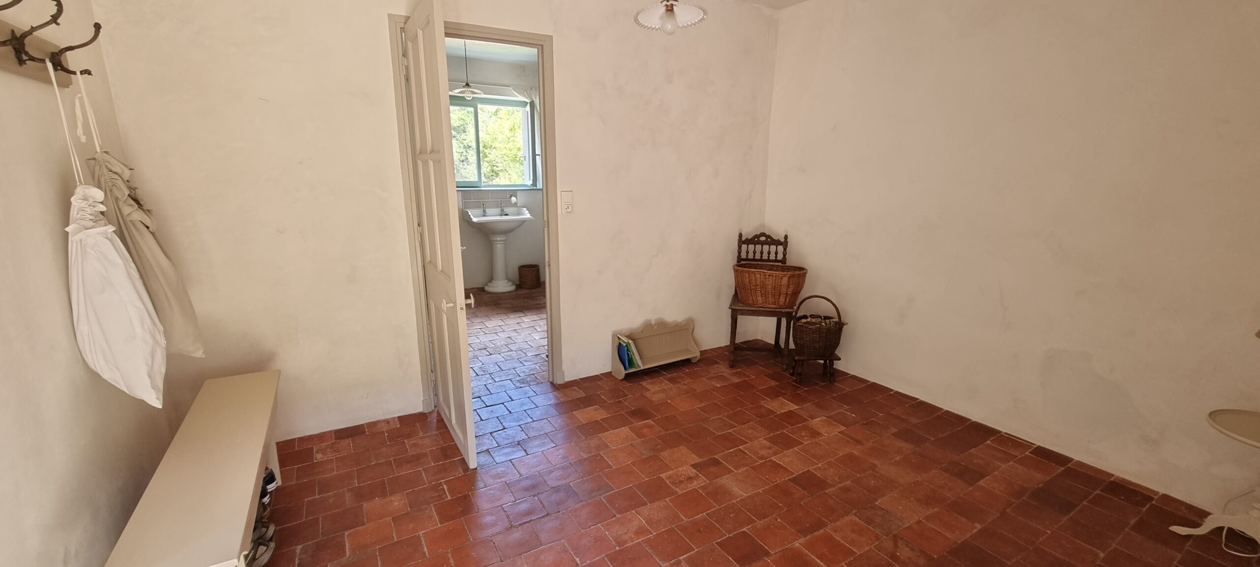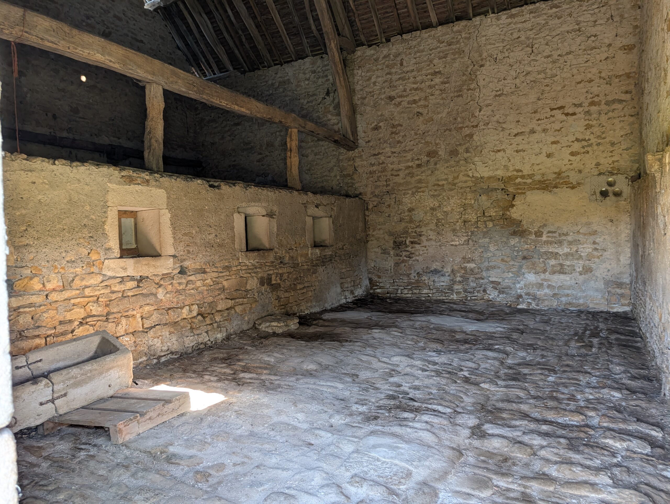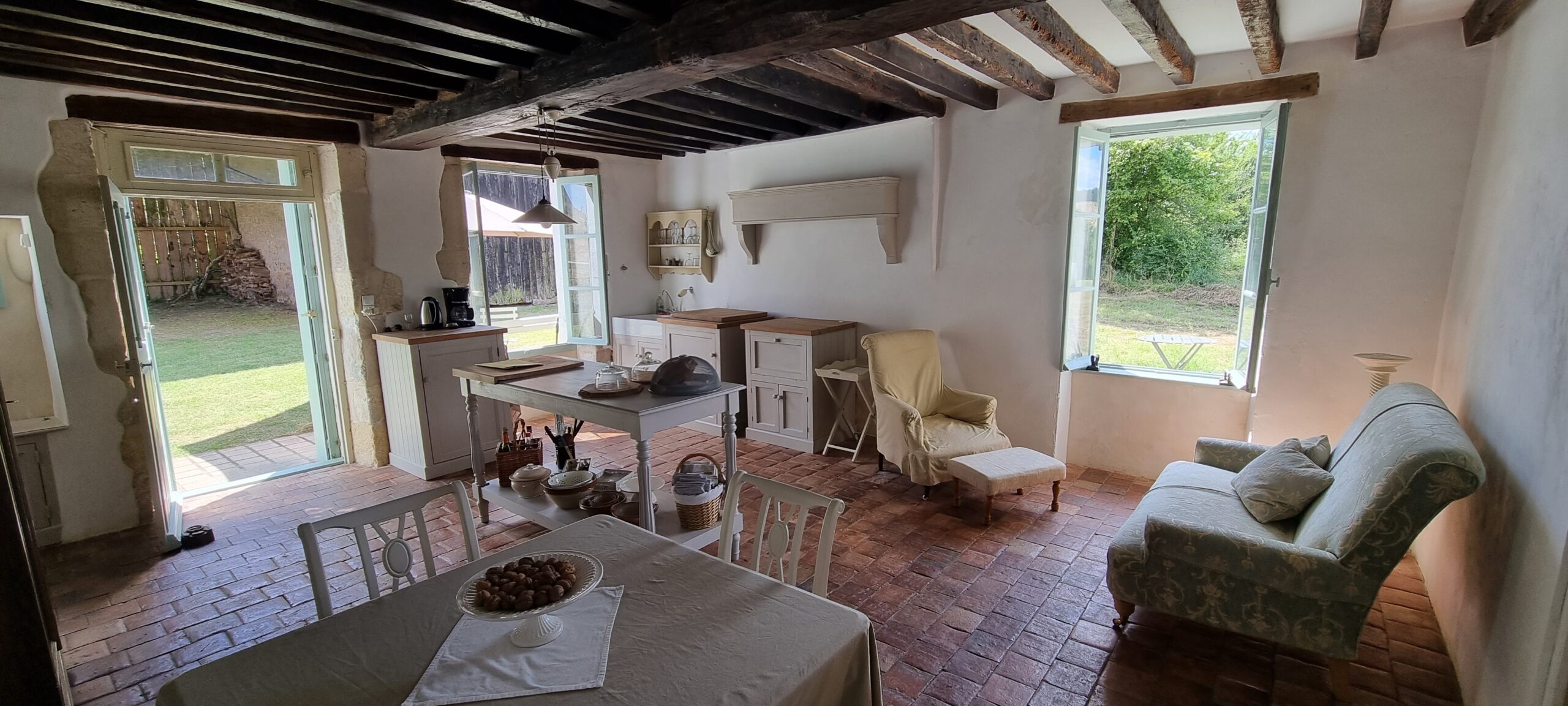 Entrée sur cuisine-salle à manger (poutres, tomettes, conduit de cheminée) 30 m², dégagement 10 m², salle de bains-WC (baignoire + douche ) 10 m², une chambre 20 m², grenier sur le tout accessible par l’extérieur.