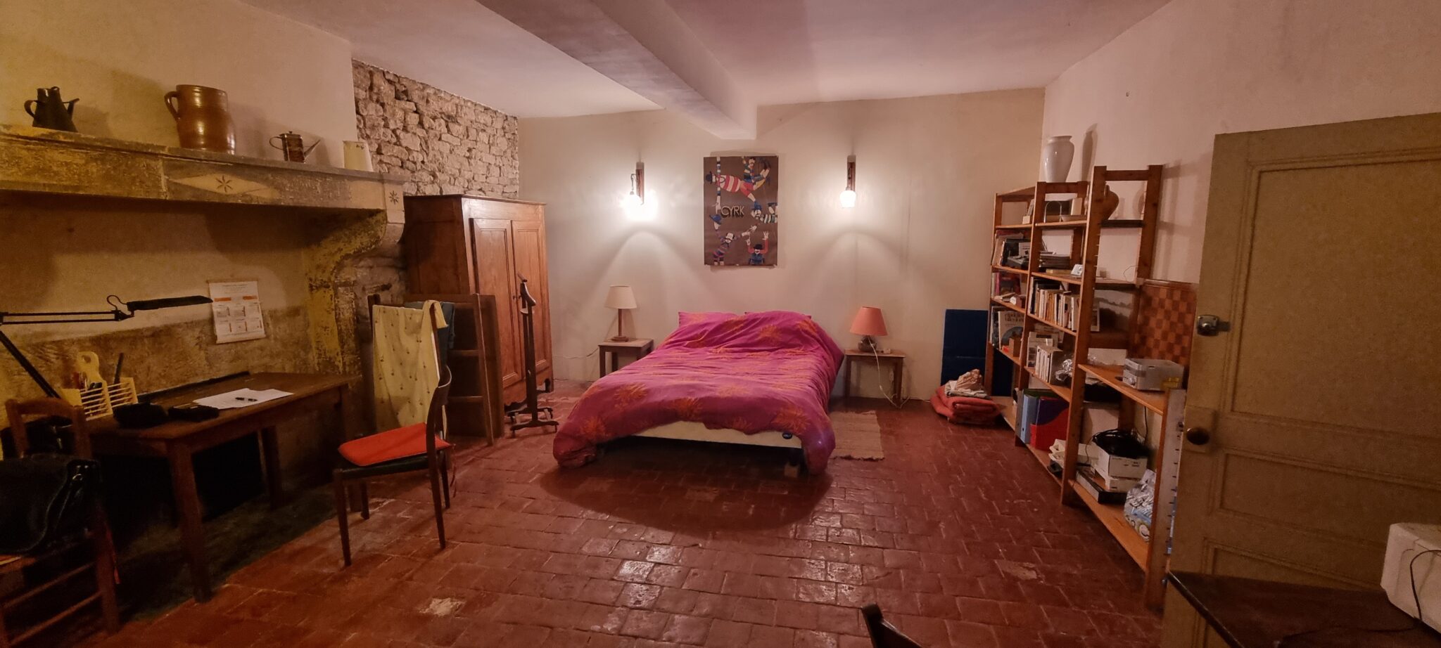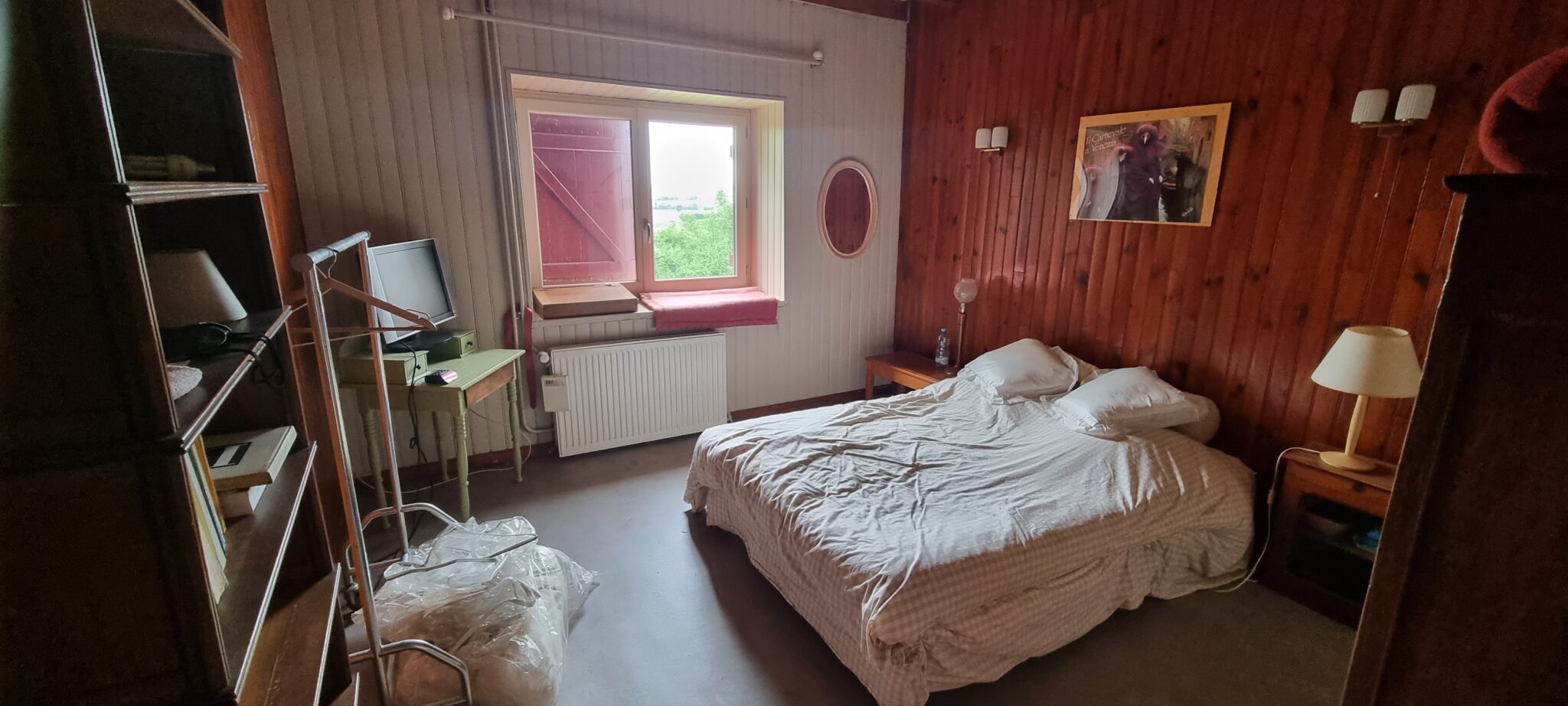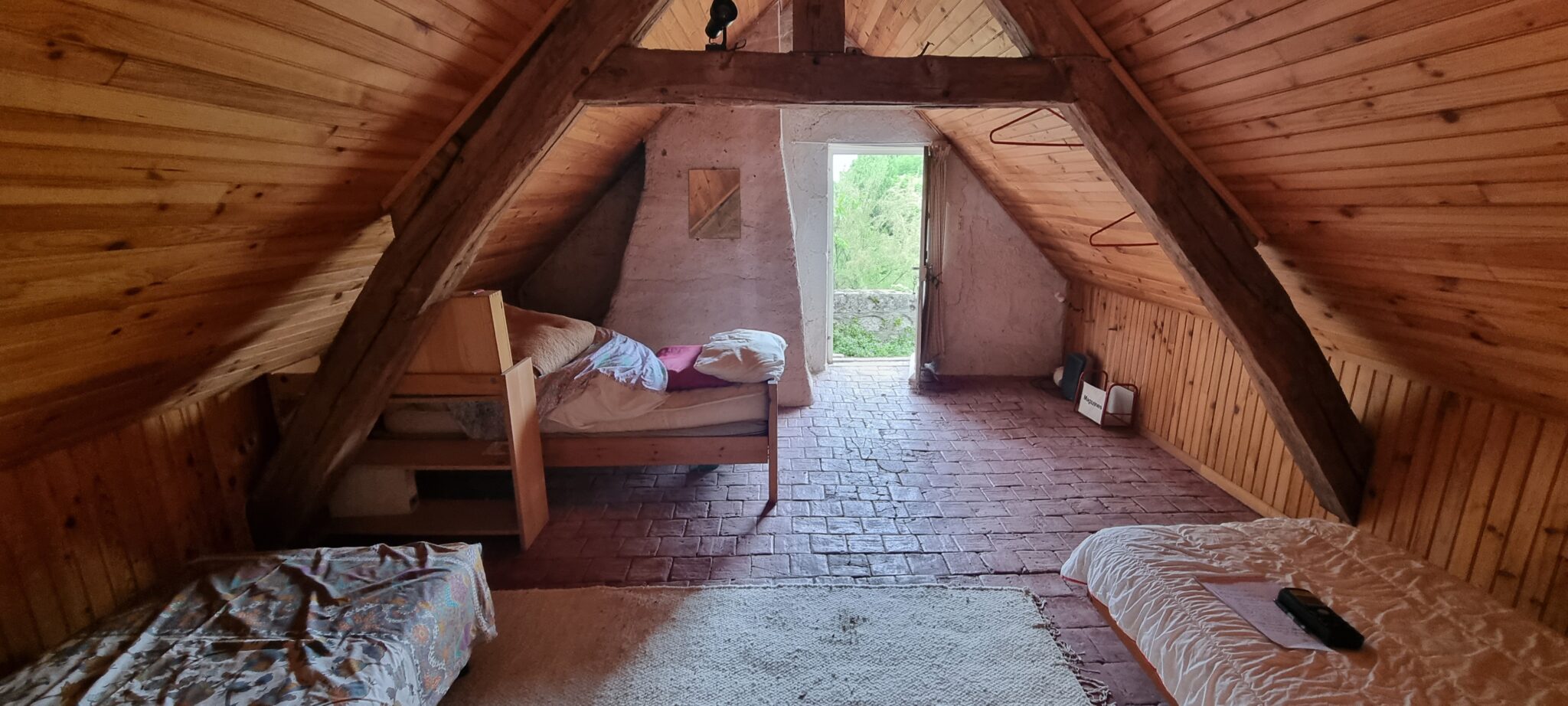 Entrée 5 m², cuisine 6 m², salle à manger 22m², salon 25 m², salle d’eau-WC 5 m², chambre 13 m². A l’étage : deux pièces mansardées en enfilade, (accès extérieur par escalier en pierre), grenier isolé à la suite avec WC 24 m².