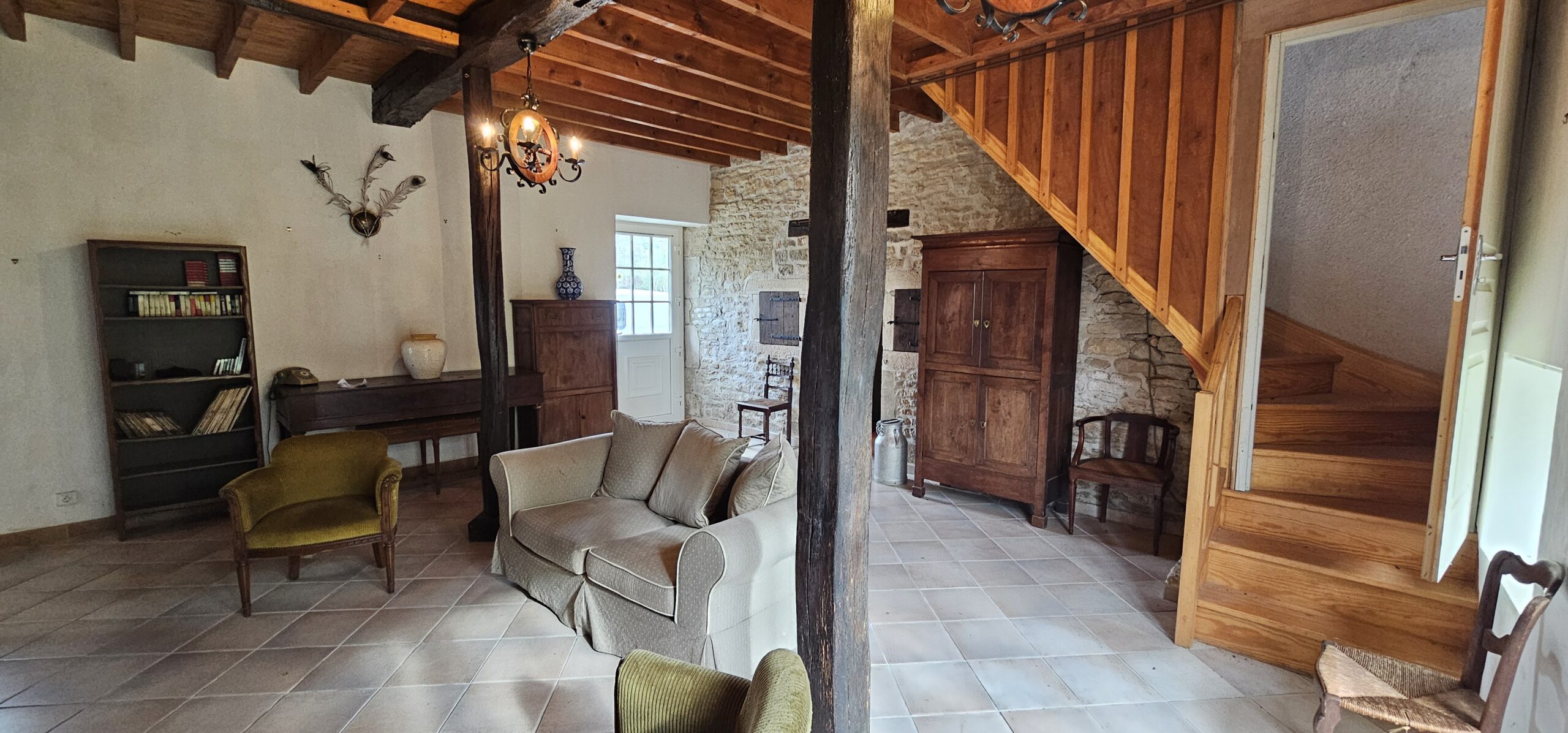 Au rez-de-chaussée, cuisine-salle à manger 31 m² avec poutres apparentes, cheminée avec poêle à bois, pierre à évier, et un accès direct au jardin. Le salon lumineux 38 m², cheminée avec poêle à bois, et accès à une terrasse. Une chambre 12 m², une salle de bains, et WC complètent ce niveau.